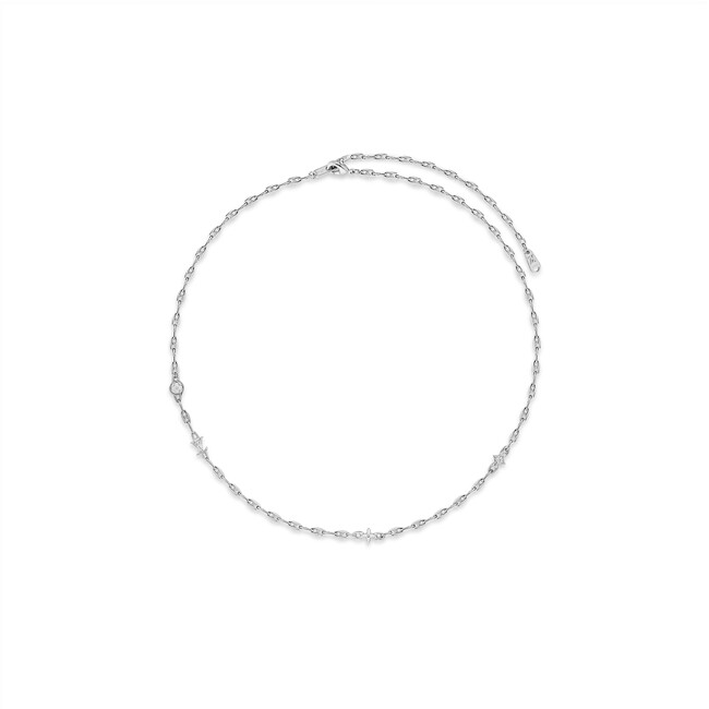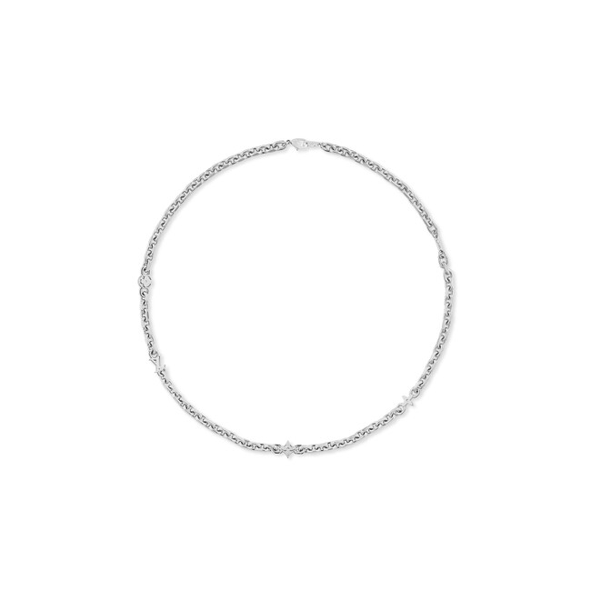 シルバーカラーのメタルで仕上げた「ネックレス・LV スピード」。繊細なスタイルは単体ではもちろん、他のアクセサリーと美しく重ね着けしても目を引きます。刻印を施した調節可能なクラスプを備えた細いチェーンの全体にモノグラム・モチーフをさりげなくあしらいました。