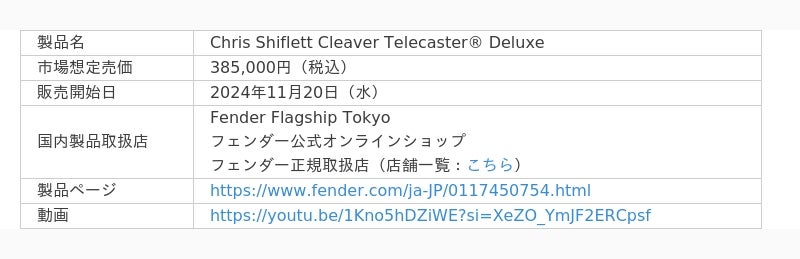 フェンダー ミュージカル インストゥルメンツ コーポレーション(所在地:米国 カリフォルニア、CEO アンディ・ムーニー、以下FMIC)は、Foo Fightersのリードギタリスト、ソロアーティスト、そしてポッドキャスト番組『Shred With Shifty』のホストとしても活躍するクリス・シフレットの新シグネイチャーモデル『Chris Shiflett Cleaver Telecaster(R) Deluxe』を発表しました。本製品は、2024年11月20日(水)より販売を開始します。