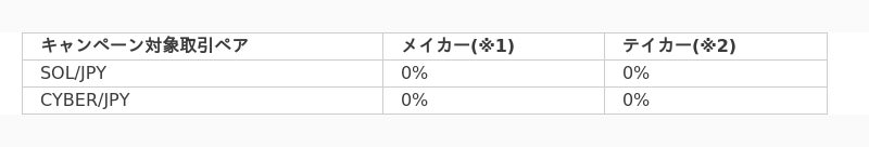 また、ソラナ(SOL)、サイバー(CYBER)の取扱開始を記念して、2024年12月19日(木)11時59分まで、期間限定キャンペーンを実施いたします。キャンペーン期間中、SOL/JPY、CYBER/JPYの取引手数料が無料となります。