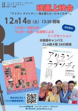 フェリス女学院大学(神奈川県/横浜市、学長:小檜山ルイ)では、ジェンダースタディーズセンター(センター長:藤巻光浩教授)とボランティアセンター(センター長:知足章宏教授)共催により、国際人権デー(12月10日)にあわせて、映画『アリラン ラプソディ~海を越えたハルモニたち~』の上映会を開催します。上映会後は、本作品映画監督と出演者によるトークセッションも行います。
