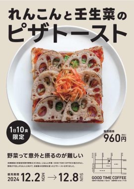 京都産業大学経営学部中野ゼミ生は、「サプライチェーンの視点からの商品開発」をテーマにゼミ活動に取り組んでいます。令和4年度の厚生労働省が発表した健康調査において、1日350gの野菜摂取量が目安のところ、男女ともに摂取量の平均値が270.3gであり、ともに低下しています。年齢別にみると20代が最も少なく、総数258.1gという結果となっています。(※1)また、農林水産省が京都の大学生に実施した、1日の野菜摂取量を調査したアンケートでは「野菜不足気味である」「完全に野菜不足気味である」と答えた学生が全体の約50%を占めており(※2)、若者の野菜摂取量の少なさが読み取れます。今回、中野ゼミ生は若者の食生活、特に野菜不足傾向であることに着目し、京都に店舗を持つ「GOOD TIME COFFEE」の協力を得て、京都の冬野菜の壬生菜、れんこんを使用したピザトーストを考案しました。若者に人気のピザトーストに色鮮やかな野菜をのせて見た目と栄養にこだわった商品を12月2日から期間限定で販売します。