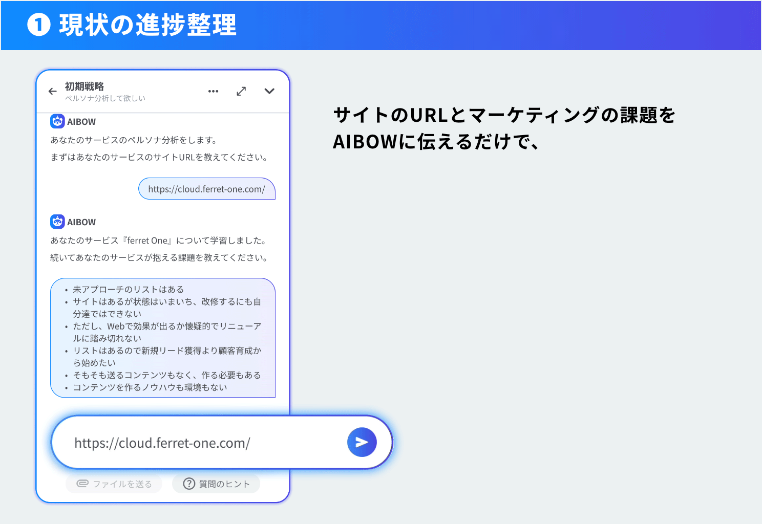 サービスサイトのURLと現状の課題をマーケティング支援AI「AIBOW」に伝えるだけで、ペルソナ設計やマーケティングプランを自動生成できます。