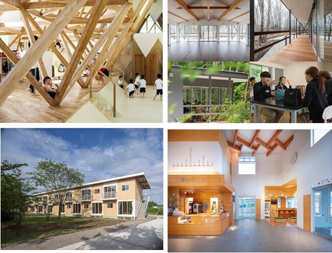 ウッドデザイン賞2024の最優秀賞。「浦河フレンドようちえん」(農林水産大臣賞)(左上)「自然へのホスピタリティーと森の中の工場(経済産業大臣賞)(右上)「DLT恒久仮設木造住宅」(国土交通大臣賞)(左下)「南阿蘇鉄道高森駅・交流施設」(環境大臣賞)(右下)。