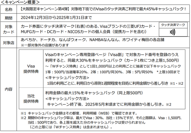 三菱UFJニコス、大阪でVisaカード会員向け“Visaのタッチ決済”キャンペーン第4弾実施 対象地下街での利用で累計金額の最大45%をもれなくキャッシュバック!