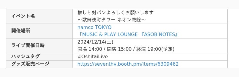 バーチャルタレント専用配信プラットフォーム「V-TIPS」は、VTuber事務所「ななはぴ」が主催するイベント「推しと対バンよろしくお願いします~歌舞伎町タワー ネオン戦線~」のオンライン配信を、2024年12月14日(土)14時から行います。本イベントは、人気VSingerたちが新宿のランドマーク・歌舞伎町タワーに集結し、会場のnamco TOKYO(ナムコトーキョー)からお送りする音楽ライブです。