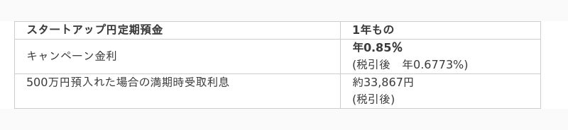 1年もののスタートアップ円定期預金の金利を年0.85%(税引前)で提供いたします。こちらは口座開設月を含む3ヵ月目の末日まで設定が可能で、インターネットだけでなく店頭窓口でも取り扱っております。