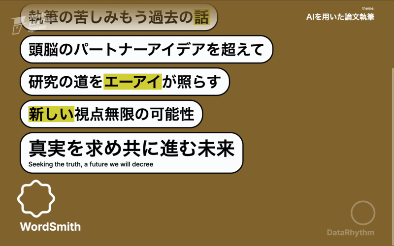 2019年に発表されたBrain Rapのリリック生成をアップデートすることを目指し、未踏スーパークリエータでもある兵庫県立大学三林亮太氏、朝日新聞社メディア研究開発センター、Think & Craftと新たにコラボレーション。例年に比べて高い競争率となった査読を通過し、SIGGRAPH ASIAのReal-time Live !セッションでの発表を行うこととなりました。