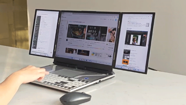 「3画面ノートPC」は配線や設置工事が不要で、電源を入れるだけでマルチディスプレイ環境となります。3画面レイアウトにより文書編集、データ分析、ビデオ編集など複数のタスクを並行して実行できるようになり、作業効率を大幅に向上します。