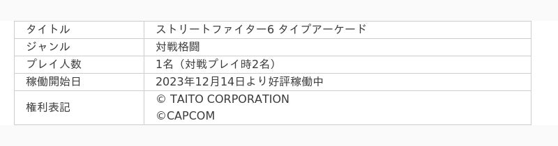 株式会社タイトー(本社:東京都新宿区)は、『ストリートファイター6 タイプアーケード(以下、SF6TA)』において、2024年12月19日(木)にアップデートを実施いたします。アップデートでは、全キャラクターのバトルバランスの調整を行います。