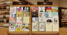 雑誌コーナー専用の棚を用意し、画面の小さなスマホでも見やすいように表紙を向けた並べ方のみ取り入れています。