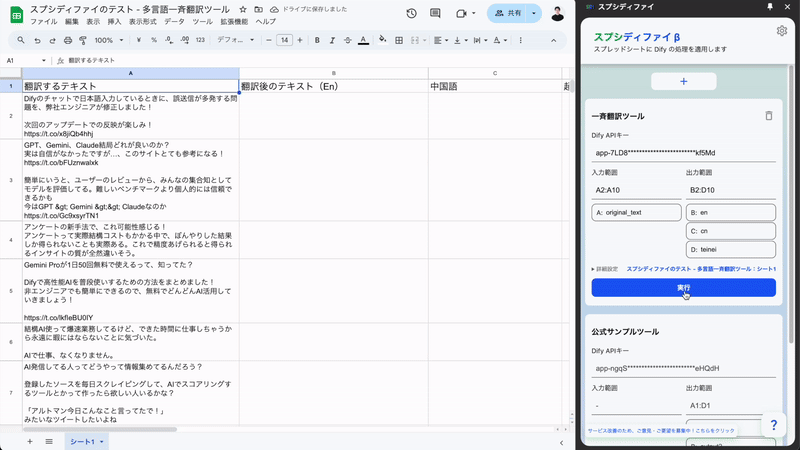 - 高速プロトタイピング:Difyで処理を作成し、スプレッドシートで結果をすぐに共有することができるので、高速にツールのプロトタイピング・利用が可能です。翻訳やスコアリングなど様々なリスト処理を気軽に試せます。