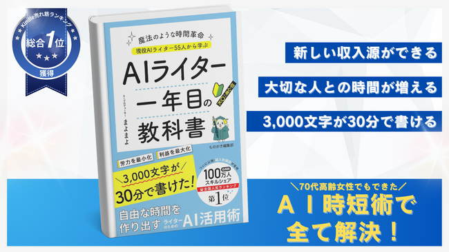 「AIライター」と聞くと、なんだか難しそうに感じる方が多いのが現状です。しかし本書では、70代の高齢女性でもできた具体的な成功事例をお伝えしています。ツールをうまく活用すれば、3,000文字を30分で書けるなど効率が大幅にアップ。余った時間で、新しい収入源を確保したり、大切な人との時間を増やすことにもつながります。