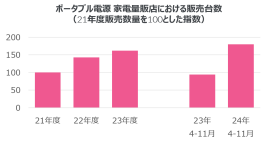 日本は地震や台風などの自然災害が多く、その影響で停電が発生するケースも多い。このような非常時にスマートフォンや家電製品に給電できるポータブル電源の需要が高まっている。家電量販店における2024年4~11月の販売数量は前年同期比90%増と、約2倍に成長した。