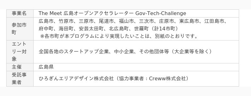 ひろぎんエリアデザイン株式会社(代表取締役 松内 紀子)では、広島県からの委託を受け、Creww株式会社(代表取締役 伊地知 天)とともに「The Meet 広島オープンアクセラレーター Gov-Tech-Challenge(ガバテックチャレンジ)」(以下「本プログラム」)を開催しています。