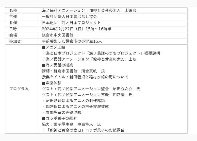 一般社団法人日本昔ばなし協会と日本財団が取り組む「海ノ民話のまちプロジェクト」は、2024年12月22日(日)、神奈川県鎌倉市にて鎌倉市を舞台に制作したアニメ「龍神と黄金の太刀」(りゅうじんとこがねのたち)の上映会を開催いたしました。