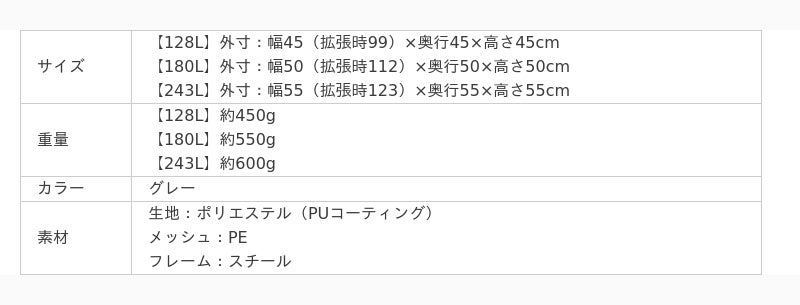 拡張して使用した場合、45リットルサイズのゴミ袋で換算すると、128リットルサイズが2袋、180リットルサイズが4袋、243リットルサイズが5袋を目安に対応しています。