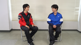 新人レーサー「オウシロウ」が、弟子入りを切望するあまり「カミオ」を追いかけまわすシーンが印象的な第1話。プライベートでも仲良しな神尾さん・旺志郎さんはどこか照れた様子で、初の先輩/後輩役を演じていました。