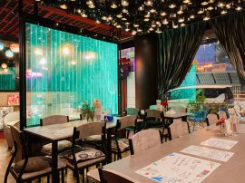 笹塚スタジオ1Fは、LED照明が仕込まれたエアパーテーション水槽やテーブルを設置した居酒屋シチュエーションです。