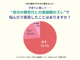 アンケートの結果によると、回答者の73.7%が「ある」と答え、大多数のママたちが子育ての価値観の違いに悩んだ経験をもつことが明らかになりました。「ない」と回答した人は19.2%、「その他」は7.1%でした。価値観のズレの内容は、次の3つがあげられます。