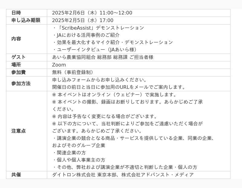 2025年2月6日(木)、株式会社アドバンスト・メディア(本社:東京都豊島区、代表取締役会長兼社長:鈴木清幸 以下、アドバンスト・メディア)は、オンラインセミナー「JAにも拡がる!『ScribeAssist』を活用したDXの新たなチャレンジ~JAあいら様の事例から読み解く働き方改革とは~」を共催いたします。