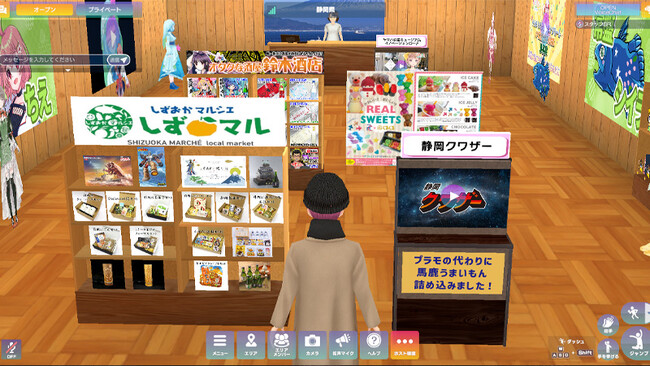 静岡県ショップには現在7名の応援大使が店頭や店内にいて、自分の操作しているアバターが近づくと音声と吹き出しで話しかけてきたり、動画で紹介したりします。