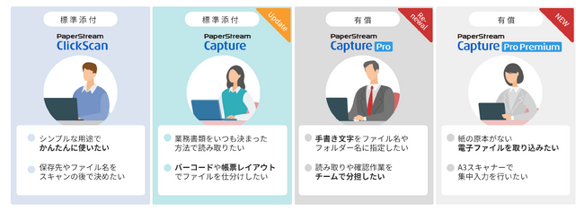 「PaperStream Capture Pro」のリニューアルに伴い、fiシリーズとあわせてご活用いただけるソフトウェアラインナップがさらに充実しました。シンプルな操作で画像のアーカイブを行える「PaperStream ClickScan」から、データ抽出や帳票仕分けまで一括で行える「PaperStream Capture Pro Premium」まで、お客様の目的や用途にあわせて最適なソフトウェアをお選びいただけます。