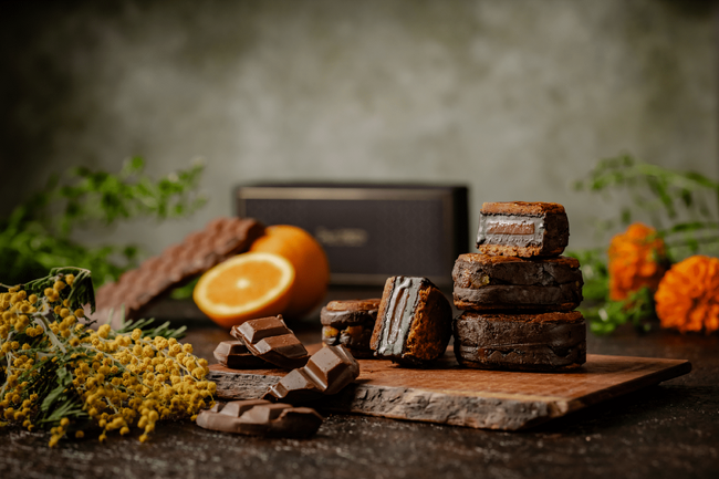 卵黄ベースのコクのあるバタークリームにダークチョコレートを加えた濃厚なクリームと、甘酸っぱいオレンジのジャムを合わせました。まるでオランジェットを思わせるような口の中に広がる芳醇なカカオの香りと、ほろ苦い大人の味わいで、特別な日に華を添えます。