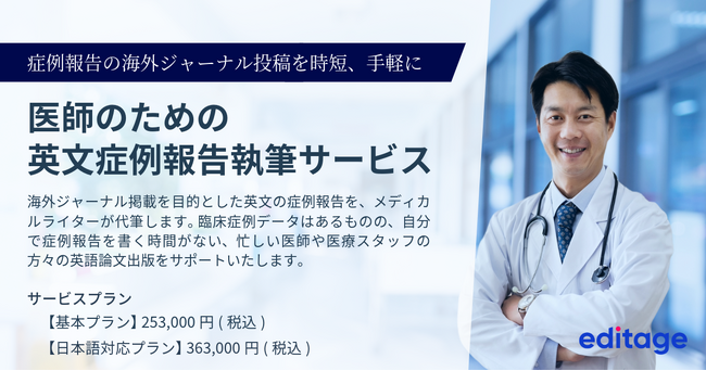 科学コミュニケーションおよびテクノロジー分野で世界的に活動するカクタス・コミュニケーションズ(Cactus Communications、本社:インド)は、同社の旗艦ブランドである研究者総合支援サービス「エディテージ(Editage) (https://www.editage.jp/ ) 」が多忙な医師に代わり、プロのメディカルライターが海外ジャーナル掲載を目指した英文症例報告を執筆する「英文症例報告執筆サービス」をリリースしたことを発表しました。このサービスにより、臨床症例データはあるものの自分で症例報告を書く時間がない、多忙な医師や医療スタッフの方々の症例出版をサポートします。