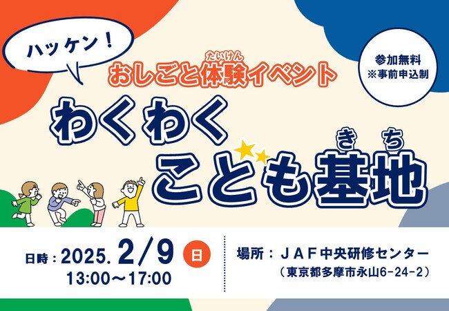 JAF(一般社団法人 日本自動車連盟)東京支部(支部長・加藤和夫)は2月9日(日)、JAF中央研修センター(東京都多摩市)にて、小学生を対象に、「おしごと体験イベント ハッケン!わくわくこども基地」を開催します。
