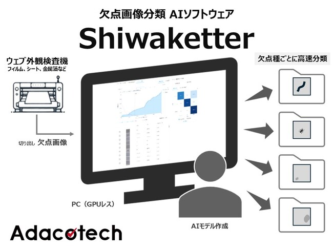 「テクノロジーで生産現場をエンパワーメントする」というミッション実現に向けて、株式会社アダコテック(東京都千代田区、代表:河邑亮太)は、ウェブと呼ばれる長尺かつ連続生産されるフィルムなどを対象とした欠点画像分類AIソフトウェア「Shiwaketter(シワケッター)」を2025年1月31日に正式リリースしました。本ソフトウェアは、PC(Core i7)上で500枚(256×256ピクセル)の欠点画像をわずか6秒で学習し、従来AIでは2時間以上を要していた画像分類を高速かつ効率的に実現します。目視確認の負担を軽減し、人間と協働しながら品質管理の効率化を推進します。