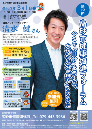 第19回高砂市健康増進フォーラム フリーアナウンサー清水健さんを講師にお招きした「健康」にまつわる記念講演を実施します 高砂市制70周年記念事業もいよいよ最終章となります!!!