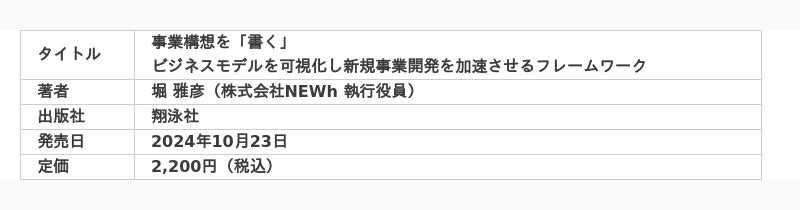 株式会社NEWh(本社:東京都千代田区、代表取締役社長:神谷 憲司)は、全国の書店やECサイトで売上ランキング上位を獲得している、当社執行役員 堀 雅彦の著書『事業構想を「書く」 ビジネスモデルを可視化し新規事業開発を加速させるフレームワーク』の再重版が決定し、累計発行部数が1万部を突破しました。本書は、全国の書店や各ECサイトでご購入いただけます。