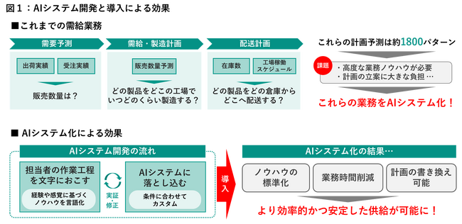こうした背景の中、当社が培った高度な業務ノウハウと、グリッドのAI技術を組み合わせ、需給管理の自動化システムを開発しました。今回開発したシステムでは、需給計画(製造計画)および在庫転送計画の自動策定が可能となりました。