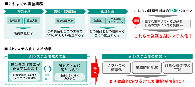 これまで日清製粉ウェルナでは、冷凍食品の需給管理と配送に関する各計画の立案を専門の担当者が担っていましたが、これらの計画予測の組み合わせは約1800パターンにものぼるため担当者に大きな負担がかかっており、業務の自動化が強く求められていました。