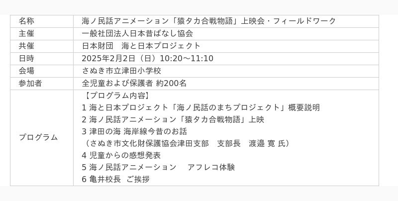 一般社団法人日本昔ばなし協会と日本財団が取り組む「海ノ民話のまちプロジェクト」は、2025年2月2日(日)、香川県さぬき市にてさぬき市を舞台に制作したアニメ「猿タカ合戦物語」の上映会とフィールドワークを開催いたしました。