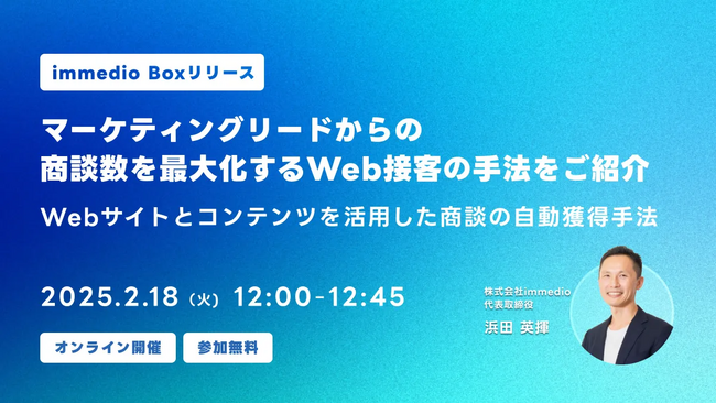 BtoB Web接客ツールを展開する、株式会社immedioは2月18日(火)にオンラインウェビナー『マーケティングリードからの商談数を最大化するWeb接客の手法をご紹介~Webサイトとコンテンツを活用した商談の自動獲得手法~』を開催いたします。