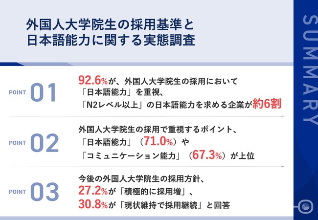 まず、92.6%が、外国人大学院生の採用において「日本語能力」を重視しており、その理由では、「社内のコミュニケーションに必要だから」が72.7%で最多となりました。また、外国人大学院生の採用にあたり、「N2レベル(ビジネスで十分なレベル)以上」の日本語能力を求めている企業が約6割にのぼり、外国人大学院生の採用における課題としては、「長期的なキャリアパスの設計」(50.5%)などが挙げられています。さらに、外国人大学院生の採用で重視するポイントでは、「日本語能力」(71.0%)や「コミュニケーション能力」(67.3%)が上位になり、今後の外国人大学院生の採用方針については、27.2%が「積極的に採用増」、30.8%が「現状維持で採用継続」と回答しました。最後に、外国人大学院生の採用を前向きに検討するために、約6割が、「採用後のフォローアップ体制」や「異文化理解研修」の必要性を感じています。