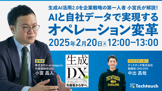 デジタルアダプションプラットフォーム(DAP)国内シェアNo.1の「テックタッチ」を開発・提供するテックタッチ株式会社(本社:東京都港区、代表取締役 CEO:井無田 仲)は2月20日(木)、『生成DX~生成AIが生んだ新たなビジネスモデル~』の著者であり株式会社d-strategy,inc(本社:東京都港区、代表:小宮 昌人、以下、d-strategy,inc)の代表者である小宮氏をゲストに招き、ウェビナーを開催致します。