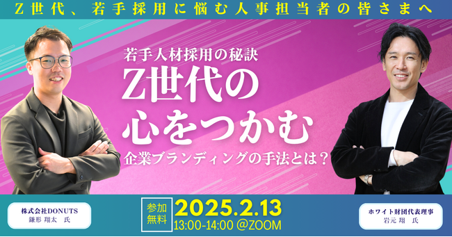 本セミナーでは、株式会社DONUTS(ジョブカン)のプロダクトマネージャー鎌形翔太氏とともに、ホワイト財団代表理事の岩元翔が、若手人材に選ばれる会社の採用戦略を企業ブランディングの視点から解説します。