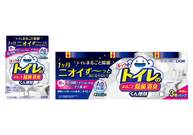そこで、お風呂のカビ対策としてご高評いただいている『ルックプラス おふろの防カビくん煙剤』(※5)の技術を活用して、銀イオンの煙がトイレのすみずみまで除菌し、新たなニオイの発生を防ぐ『トイレのまるごと除菌消臭くん煙剤』を新発売いたします。