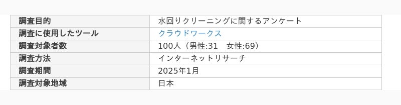 おうちにプロでは、水回りクリーニングを検討中の方により有益な情報を提供するために、「水回りクリーニングに関するアンケート」を実施しました。アンケート調査の概要は以下の通りです。