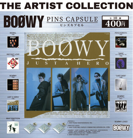 2024年6月に発売を開始した『THE ARTIST COLLECTION』では、これまで、第1弾に3アーティスト(THE BEATLES/QUEEN/DAVID BOWIE)、第2弾に2アーティスト(The Rolling Stones/KISS)、第3弾にBON JOVI、第4弾にAEROSMITH、第5弾に4アーティスト(THE BEATLES/Guns N' Roses/The Rolling Stones第2弾/DAVID BOWIE第2弾)第6弾にTHE WHOと、伝説的な海外アーティストのピンズカプセルトイを発売。今回の第7弾では、シリーズ初の国内アーティストとなる、日本のロックシーンに革命をもたらした伝説的なバンド「BOØWY」が登場。1980年代に活動した彼らは数々のヒット曲を生み出し、今なお多くのアーティストに影響を与え続けています。また、彼らの音楽はエネルギッシュで革新的なサウンドとリスナーに共感する歌詞で多くのファンを魅了し、時代を超えて愛される普遍的な魅力をもち続けています。