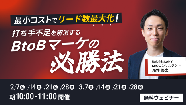 デジタルマーケティング支援を行う株式会社LANY(東京都渋谷区、代表取締役社長:竹内渓太)は、【無料ウェビナー】最小コストでリード数最大化!打ち手不足を解消するBtoBマーケの必勝法を3/28(金)まで複数日程開催いたします。