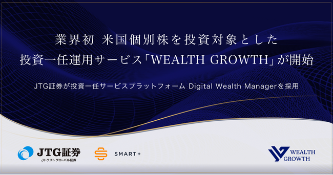 次世代金融インフラの提供を通して組込型金融を実現するFinatextグループの株式会社スマートプラス(本社:東京都千代田区、代表取締役:小林 紀子、以下「当社」)は、Jトラストグローバル証券株式会社(本社:東京都渋谷区、代表取締役社長:矢田 耕一、以下「JTG証券」)が、当社の投資一任プラットフォームである「Digital Wealth Manager (デジタル・ウェルス・マネージャー、以下「DWM」)」を活用し、米国個別株のおまかせ運用サービス「WEALTH GROWTH(ウェルスグロース)」の提供を2025年2月13日(木)より開始したことをお知らせいたします。米国個別株を対象とした個人投資家向けの投資一任運用サービスは「WEALH GROWTH」が国内業界初※となります。