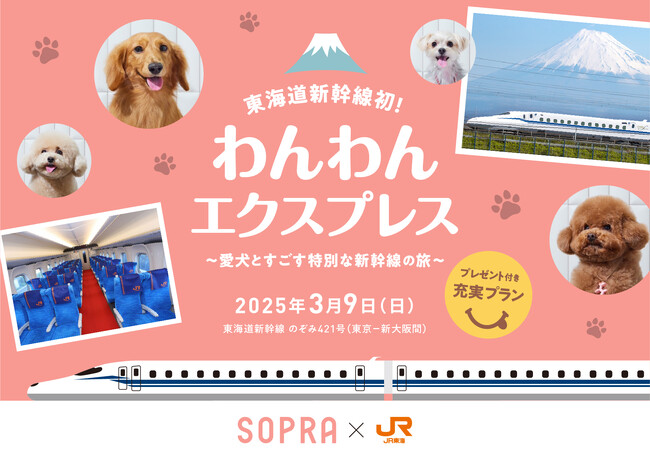 ペットに寄り添ったトータルケアを提供するソプラ銀座株式会社(本社:東京都中央区、代表取締役社長:須田哲崇)は、このたび東海旅客鉄道株式会社(JR東海)とのコラボレーションにより、愛犬と一緒に東海道新幹線に乗車できる「わんわんエクスプレス」の運行イベントを3月9日に実施いたします。