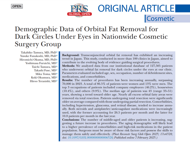 論文「Demographic Data of Orbital Fat Removal for Dark Circles Under Eyes in Nationwide Cosmetic Surgery Group」
