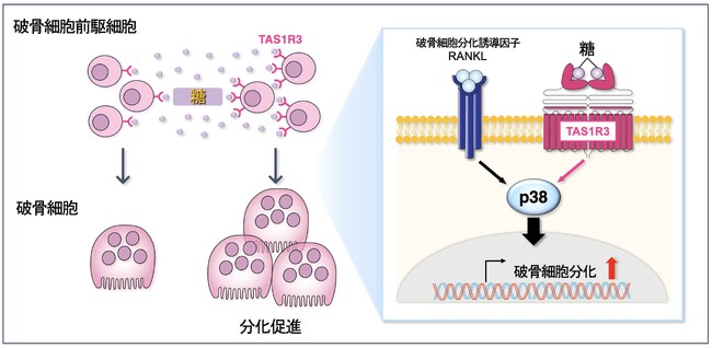 本研究により、TAS1R3は破骨細胞前駆細胞(※6)に存在し、破骨細胞の分化とともにその量が増加することがわかりました。また、TAS1R3が存在しない破骨細胞前駆細胞では、破骨細胞への分化や成熟の能力が低下する一方で、TAS1R3 を多く発現する破骨細胞では、その能力が顕著に向上しました。通常、口腔内ではTAS1R3 はTAS1R1とヘテロダイマーを形成してうま味を、TAS1R2とヘテロダイマーを形成して甘味を受容します。しかし、破骨細胞前駆細胞や破骨細胞では、TAS1R3がホモダイマーを形成して機能している可能性が高いことが、結合実験や立体構造解析によって明らかになりました。さらに、TAS1R3 に対する糖の刺激は、p38という破骨細胞の分化に必要な分子を活性化することが確認されました。p38の働きを妨げる薬剤で処理すると、TAS1R3が破骨細胞の分化を促進する現象も抑制されました。