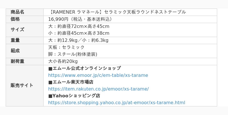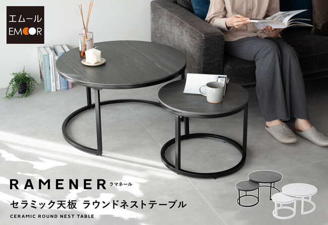「身体に合った寝る・座る」を提供する健康家具ブランドEMOORを展開する株式会社エムール(東京都立川市:代表取締役 高橋 幸司)は、2025年2月13日よりセラミック天板ラウンドネストテーブル【RAMENER/ラマネール】(以下RAMENER)の販売を開始しました。RAMENERは、高級感と機能性を兼ね備えたラウンドネストテーブルです。上質なセラミックが美しく、シーンに合わせてテーブルを展開・収納できます。