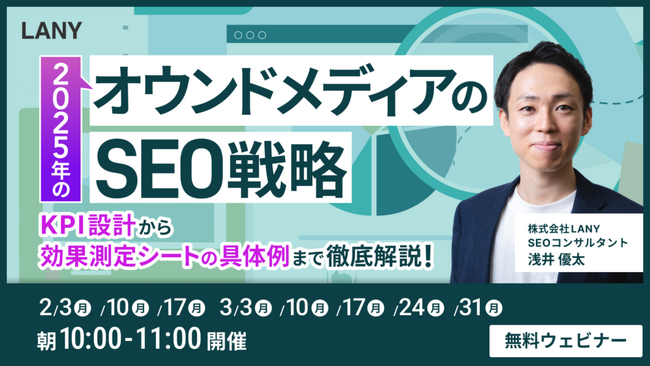 デジタルマーケティング支援を行う株式会社LANY(東京都渋谷区、代表取締役社長:竹内渓太)は、【無料ウェビナー】2025年のオウンドメディアのSEO戦略 KPI設計から効果測定シートの具体例まで徹底解説!を3/31(月)まで複数日程開催いたします。