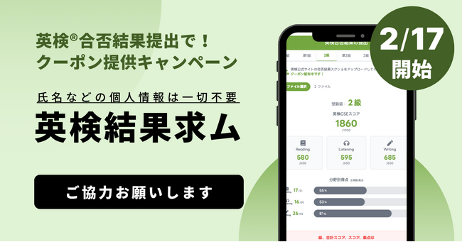 2025年2月17日(月)は、英検(R)2024年度第3回の一次試験合否が公式サイト上でオンライン発表される日です。多くの受験生が結果を確認するタイミングで、本機能をリリースすることで最大限の協力を募り、データの収集効率を高める狙いがあります。